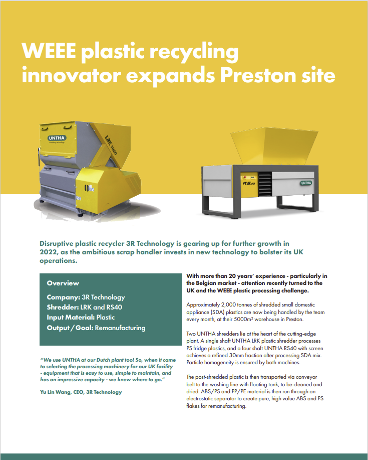 Back to clients 3R Technology Disruptive plastic recycler 3R Technology is gearing up for further growth in 2022, as the ambitious scrap handler invests in new technology to bolster its UK operations. “We use UNTHA at our Dutch plant too! So, when it came to selecting the processing machinery for our UK facility – equipment that is easy to use, simple to maintain, and has an impressive capacity – we knew where to go.” Yu Lin Wang, CEO, 3R Technology With more than 20 years’ experience – particularly in the Belgian market – attention recently turned to the UK and the WEEE plastic processing challenge. Approximately 2,000 tonnes of shredded small domestic appliance (SDA) plastics are now being handled by the team every month, at their 5000m2 warehouse in Preston. Two UNTHA shredders lie at the heart of the cutting-edge plant. A single shaft UNTHA LRK plastic shredder processes PS fridge plastics, and a four shaft UNTHA RS40 with screen achieves a refined 30mm fraction after processing SDA mix. Particle homogeneity is ensured by both machines. The post-shredded plastic is then transported via conveyor belt to the washing line with floating tank, to be cleaned and dried. ABS/PS and PP/PE material is then run through an electrostatic separator to create pure, high value ABS and PS flakes for remanufacturing.