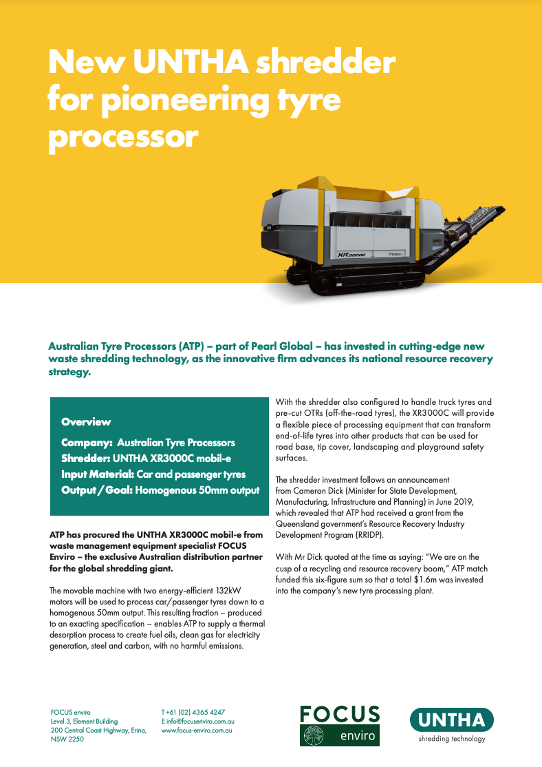 Back to clients ATP Australian Tyre Processors (ATP) – part of Pearl Global – has invested in cutting-edge new waste shredding technology, as the innovative firm advances its national resource recovery strategy. ATP has procured the UNTHA XR3000C mobil-e from waste management equipment specialist FOCUS Enviro – the exclusive Australian distribution partner for the global shredding giant. The movable machine with two energy-efficient 132kW motors will be used to process car/passenger tyres down to a homogenous 50mm output. This resulting fraction – produced to an exacting specification – enables ATP to supply a thermal desorption process to create fuel oils, clean gas for electricity generation, steel and carbon, with no harmful emissions.