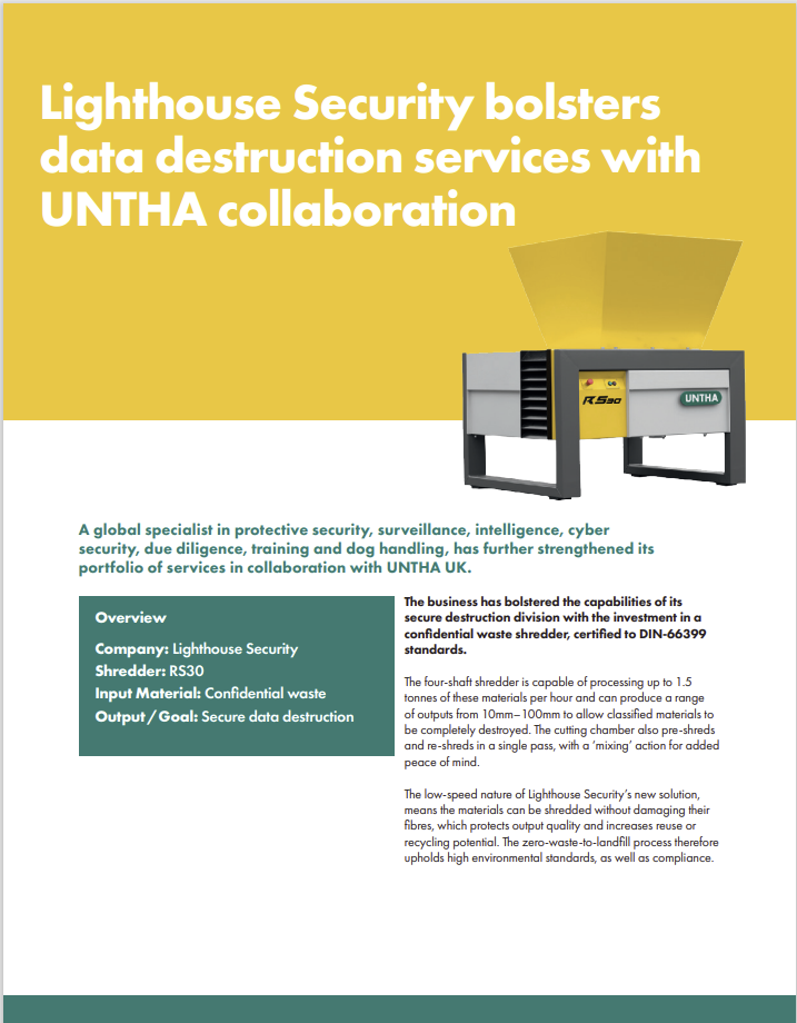 Back to clients Lighthouse Security A global specialist in protective security, surveillance, intelligence, cyber security, due diligence, training and dog handling, has further strengthened its portfolio of services in collaboration with UNTHA UK. The business has bolstered the capabilities of its secure destruction division with the investment in a confidential waste shredder, certified to DIN-66399 standards. The four-shaft shredder is capable of processing up to 1.5 tonnes of these materials per hour and can produce a range of outputs from 10mm–100mm to allow classified materials to be completely destroyed. The cutting chamber also pre-shreds and re-shreds in a single pass, with a ‘mixing’ action for added peace of mind. The low-speed nature of Lighthouse Security’s new solution, means the materials can be shredded without damaging their fibres, which protects output quality and increases reuse or recycling potential. The zero-waste-to-landfill process therefore upholds high environmental standards, as well as compliance.