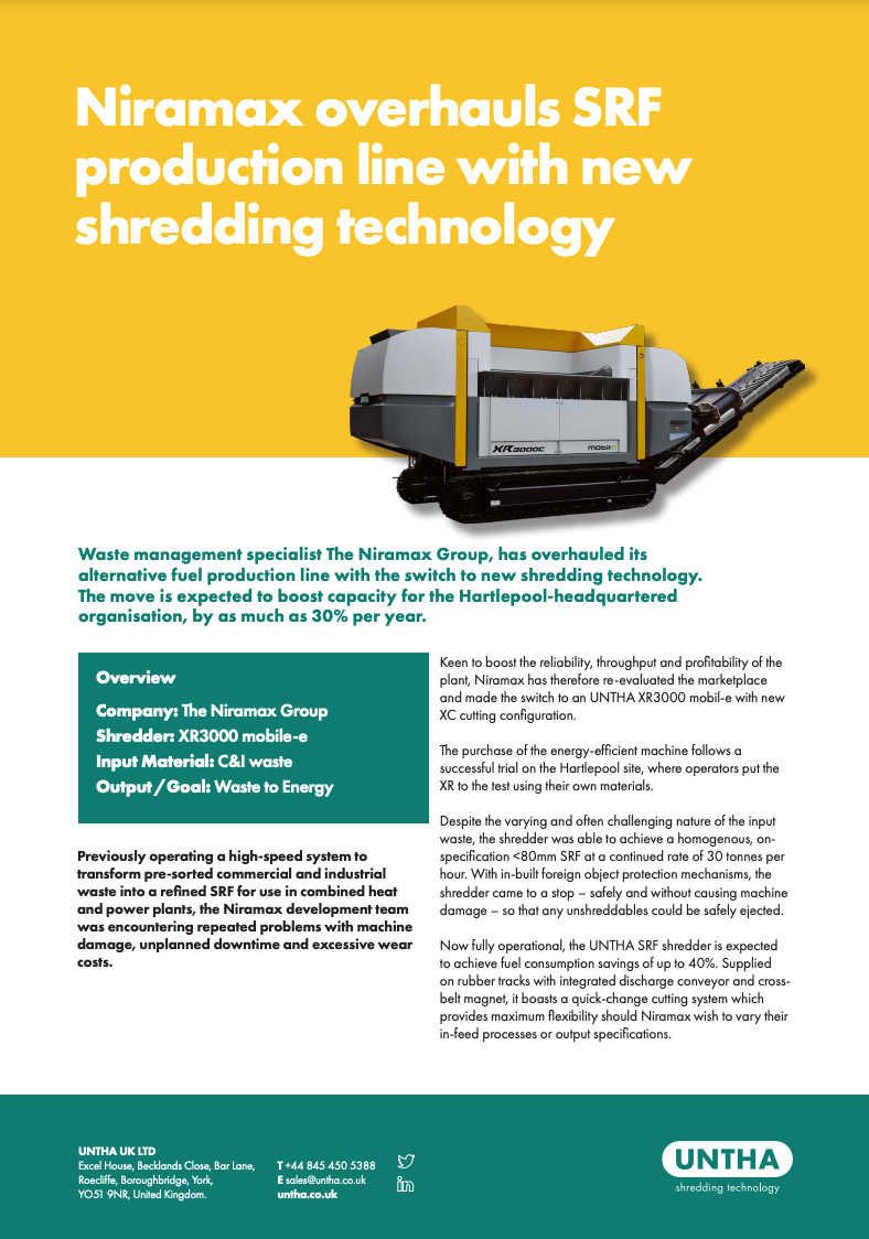Back to clients Niramax Waste management specialist The Niramax Group, has overhauled its alternative fuel production line with the switch to new shredding technology. The move is expected to boost capacity for the Hartlepool-headquartered organisation, by as much as 30% per year. Previously operating a high-speed system to transform pre-sorted commercial and industrial waste into a refined SRF for use in combined heat and power plants, the Niramax development team was encountering repeated problems with machine damage, unplanned downtime and excessive wear costs. Keen to boost the reliability, throughput and profitability of the plant, Niramax has therefore re-evaluated the marketplace and made the switch to an UNTHA XR3000 mobil-e with new XC cutting configuration. The purchase of the energy-efficient machine follows a successful trial on the Hartlepool site, where operators put the XR to the test using their own materials.