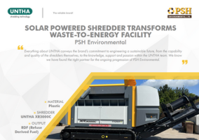 Back to clients PSH Environmental Ltd Norwich-headquartered PSH Environmental Ltd has unveiled a pioneering new project to transform waste into a renewable energy source — using only solar power. The announcement comes following a significant re-investment into a 12,000ft² new building, 40% extension to the yard, new wash plant, solar system, and an UNTHA XR3000C mobil-e shredder which lies at the heart of the facility. Capable of processing a range of difficult waste materials for alternative fuels, the electric-driven XR3000C runs entirely from solar energy generated by PSH Environmental, on site. A 90mm screen processes grade C wood down to a homogenous biomass product for a local energy plant, while a 130mm screen can be interchanged in as little as 15 minutes, to enable PSH Environmental to reduce the density of other skip, bulky and C&I wastes, for RDF. The flexible shredder can also handle other bespoke products — even those notoriously considered economically unshreddable or too difficult to handle. The plant is now capable of throughputs of 40 tonnes of material per hour, which equates to 80,000 tonnes per annum.