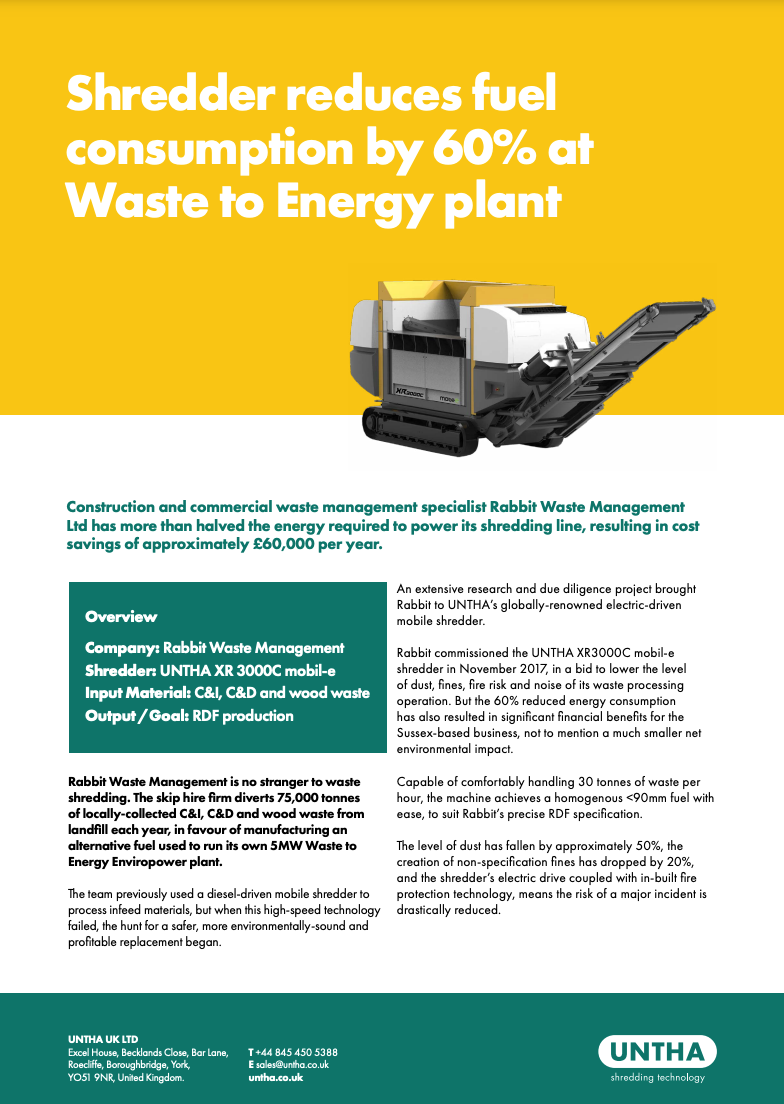 Back to clients Rabbit Waste Management Construction and commercial waste management specialist Rabbit Waste Management Ltd has more than halved the energy required to power its shredding line, resulting in cost savings of approximately £60,000 per year. Rabbit Waste Management is no stranger to waste shredding. The skip hire firm diverts 75,000 tonnes of locally-collected C&I, C&D and wood waste from landfill each year, in favour of manufacturing an alternative fuel used to run its own 5MW Waste to Energy Enviropower plant. The team previously used a diesel-driven mobile shredder to process infeed materials, but when this high-speed technology failed, the hunt for a safer, more environmentally-sound and profitable replacement began.